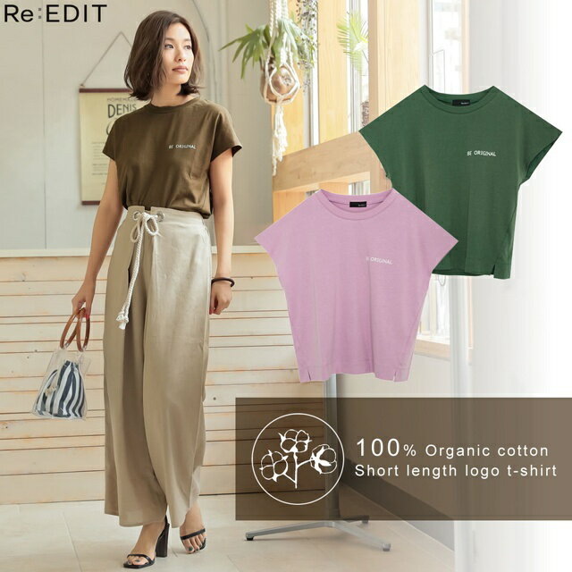 女性らしいフレンチスリーブ オーガニックコットンボートネックロゴTシャツ