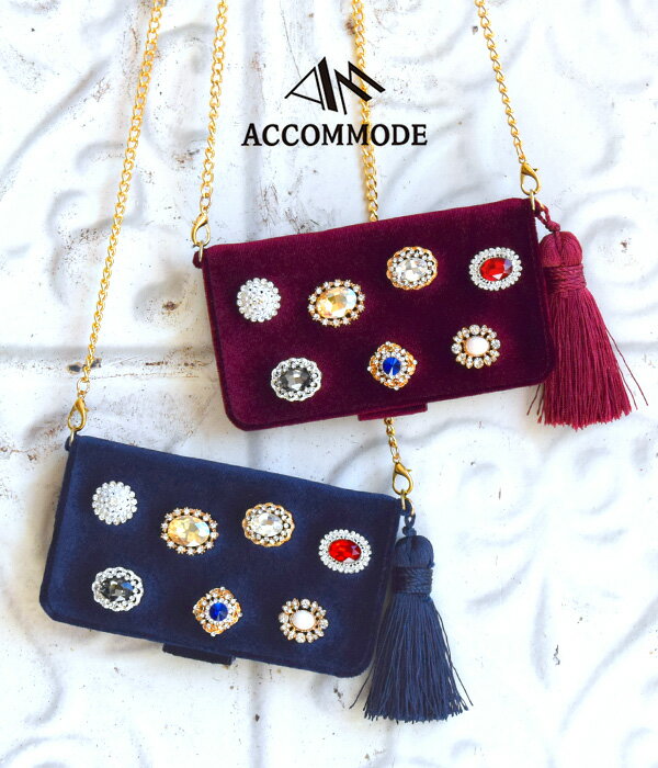 NEW! ジュエリーボックスiPhoneケース 上質なベロアに、ジュエリーのようなパーツが輝られた手帳型スマホケース。ポシェット感覚で持てる、長めのチェーンショルダーも付いています。本体をマグネットで開けると、中はつるっとしたフェイクレザー調の素材。左サイドはカードホルダーと鏡が設置されています。 |