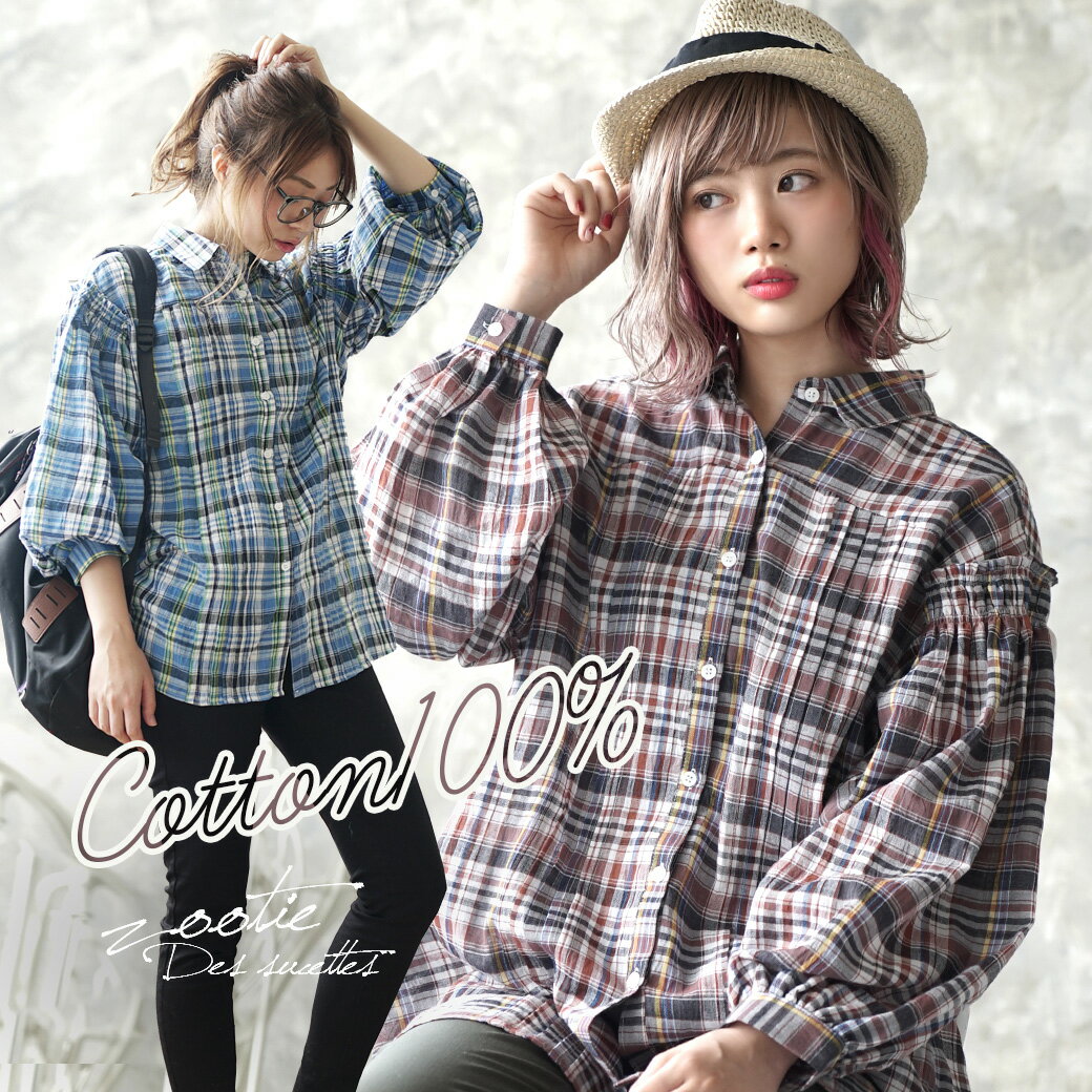 | SALE!→2,494円(税込) ギャザーパフスリーブチェックシャツ |