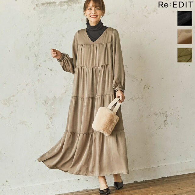光沢感とくすみが同居する 複雑な表情のヴィンテージサテンを たっぷり使用したロングワンピース ハイネックトップスとレイヤードしたり ウエストバッグでブラウジングして 今年らしく着こなすのがおすすめです