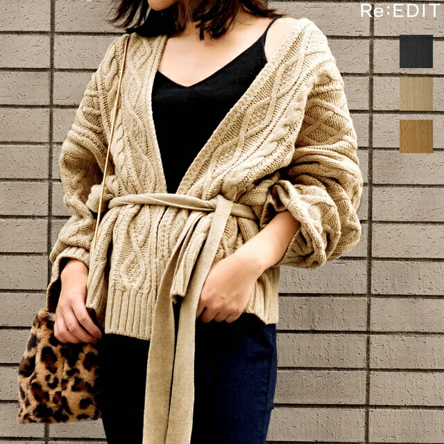 ゆったり感がフェミニンな ケーブル編みカーディガン♪ リボンベルトでブラウジングして 今年らしく肩を落としてきると 女っぽく着こなしていただけます!