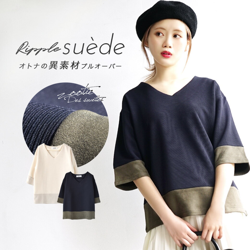 zootie(ズーティー):スウェード切替 Vネック リップル プルオーバー